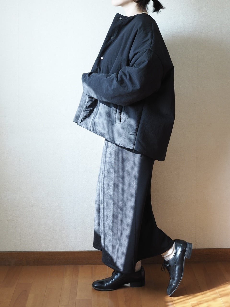 異素材切替にゴールドファスナーのデザインがおしゃれな一着です。