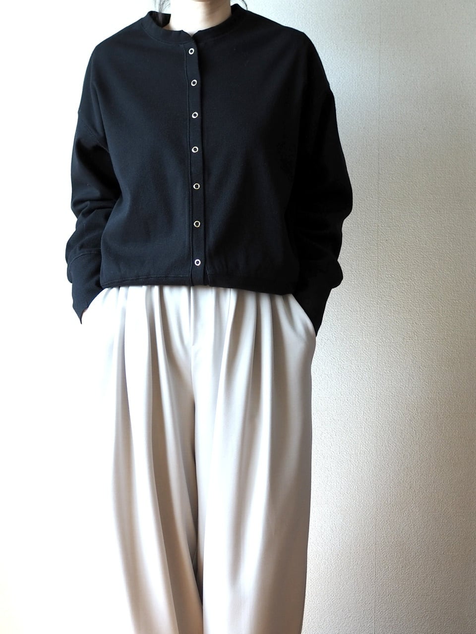 前あきでカーデとして羽織ったり、Tシャツとして着用したりと、着回しも抜群です。