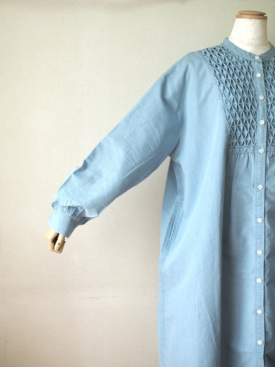 胸元のハンドスモッキングのデザインがおしゃれな一着。