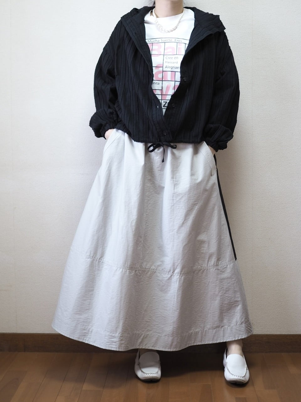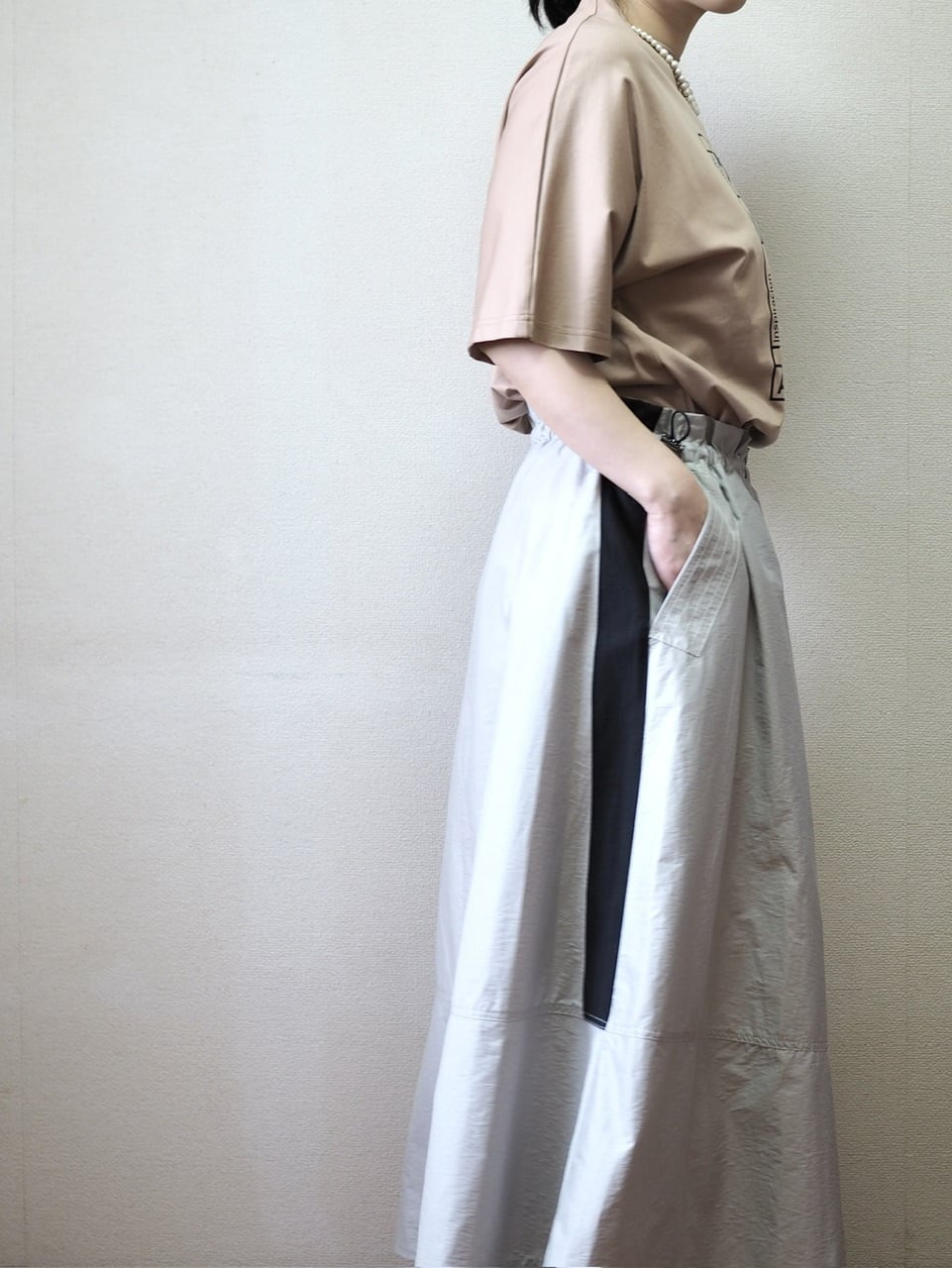 ワイドですが、シンプルなシルエットで着やすい一着です。
